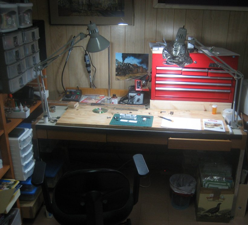 It’s been embarrassingly long since I last posted on this blog. The reason? Well, our family started to grow again, and I had to find space for a queen size bed in what used to be called the train room. Needless to say, this entailed a huge disruption to train construction. The train desk used to take up a whole wall of the basement; now, however, all the bookshelves that were along another wall have had to move under the layout to make room for a murphy bed. So the train desk had to move again, and has shrunk from 14′ long to about 6′, including photo studio. You can see the new compact version here.